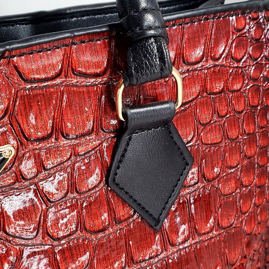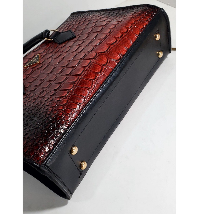 - تصميم ساحر: تتميز بجلد صناعي متين بنقشة جلد التمساح البارزة، مع تداخل ساحر للون البرغندي الداكن والأسود، مما يجعلها قطعة لافتة للأنظار.